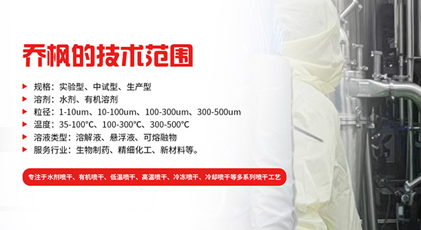 上海喬楓實(shí)業(yè)有限公司,成立于2012年,是從事噴霧干燥設(shè)備的研發(fā)設(shè)計(jì)、生產(chǎn)、銷售(小型噴霧干燥機(jī)實(shí)驗(yàn)型噴霧干燥機(jī),35℃低溫噴霧干燥機(jī),有機(jī)溶劑噴霧干燥機(jī),低溫閉式循環(huán)噴霧干燥機(jī)超細(xì)粉末噴霧干燥機(jī)噴霧冷凍干燥機(jī)真空噴霧干燥機(jī)、氣流噴霧干燥機(jī)噴霧造粒干燥機(jī)離心噴霧干燥機(jī)沸騰制粒機(jī)等)和售后于一體的綜合性公司,本公司現(xiàn)成為一家致力于為生物制藥、精細(xì)化工、新能源、陶瓷造粒及食品工程等領(lǐng)域提供全套解決方案的整線交鑰匙工程企業(yè)。