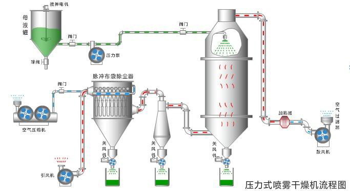 力噴霧干燥塔工作原理如下:通過2-20MPa的高壓將液料(經(jīng)過過濾的液料)送入壓力式霧化器霧化成小液滴,經(jīng)過霧化后的液滴(表面積大大增加)與熱空氣充分接觸,在10-30秒內(nèi)迅速完成干燥過程。得到粉體或細(xì)小顆粒的成品。
