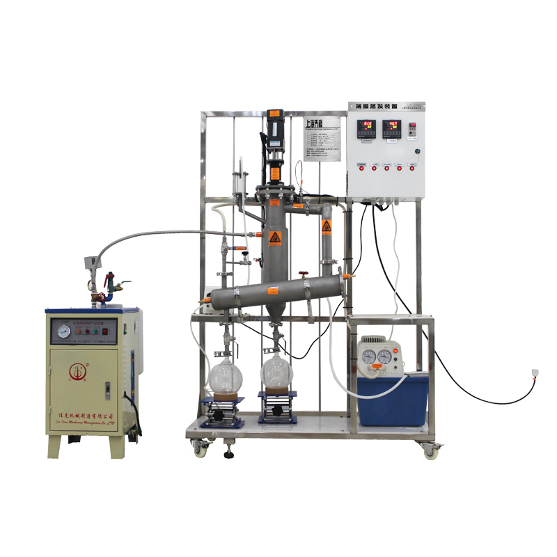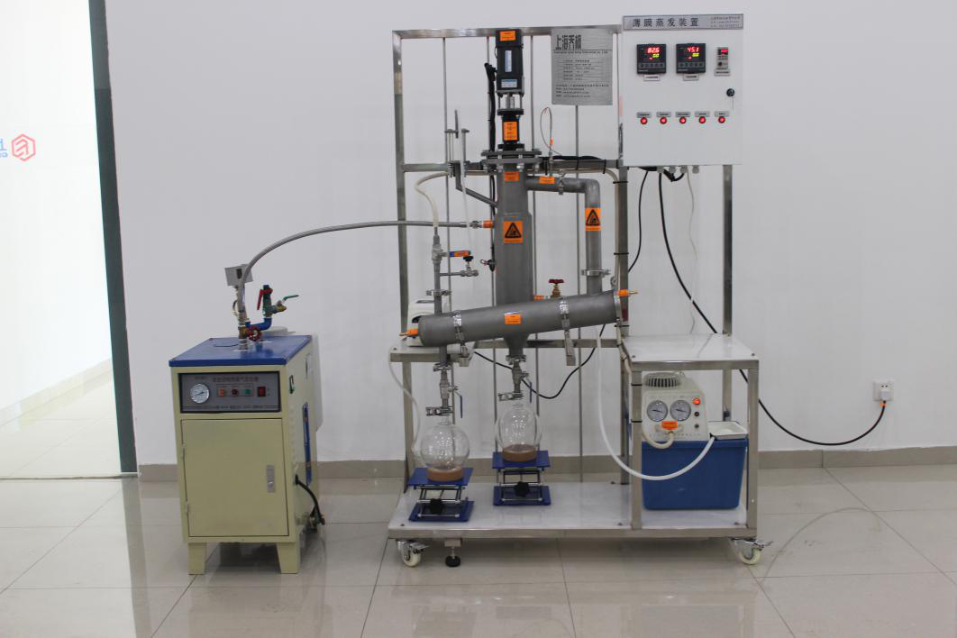 • 受熱時間短: 由采用垂直刮板成膜設計,物料在加熱壁上的停留時間短,對其他蒸餾而言,受熱時間一般較長(30分鐘以上甚至幾十個小時),而刮板薄膜蒸餾僅為十幾秒。熱分解的可能被縮小。